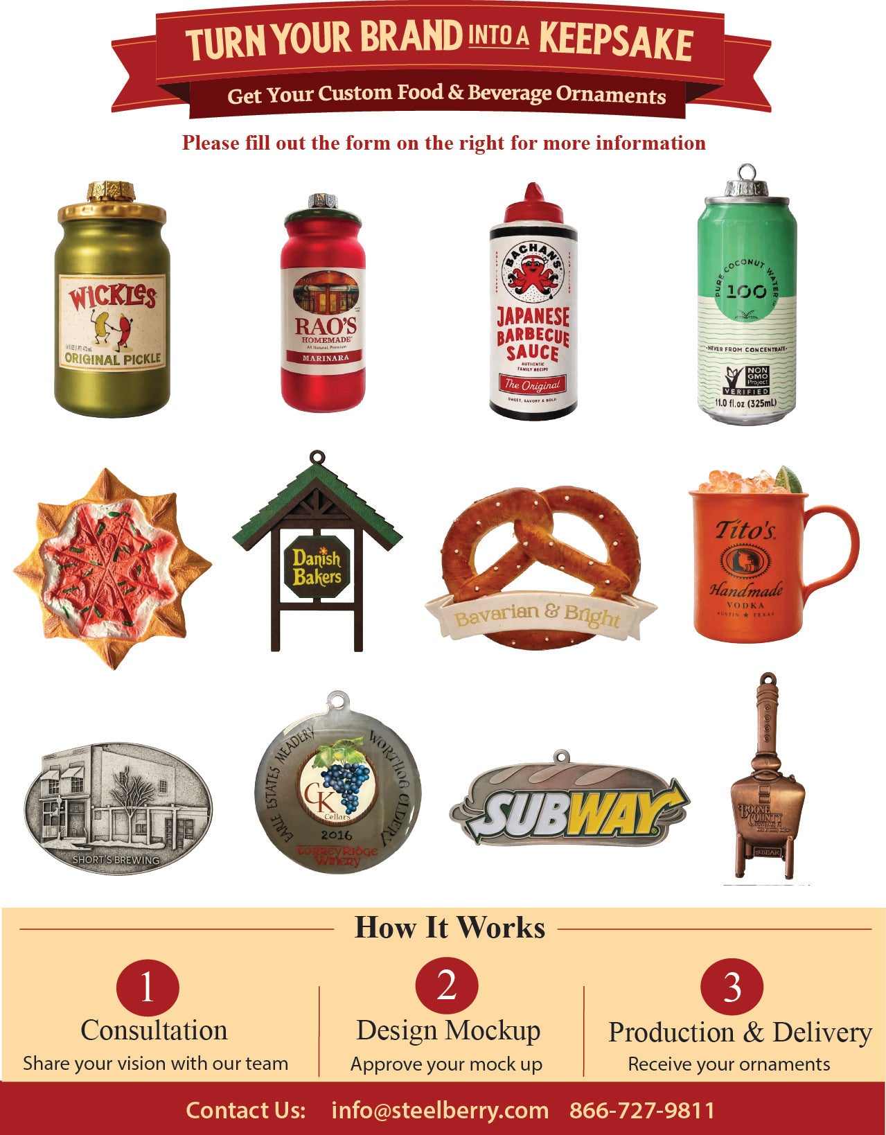 SteelBerry creates premium custom ornaments for food and beverage brands. Perfect for holiday gifts, promotional giveaways, and packaging accents that showcase your logo and elevate your brand
